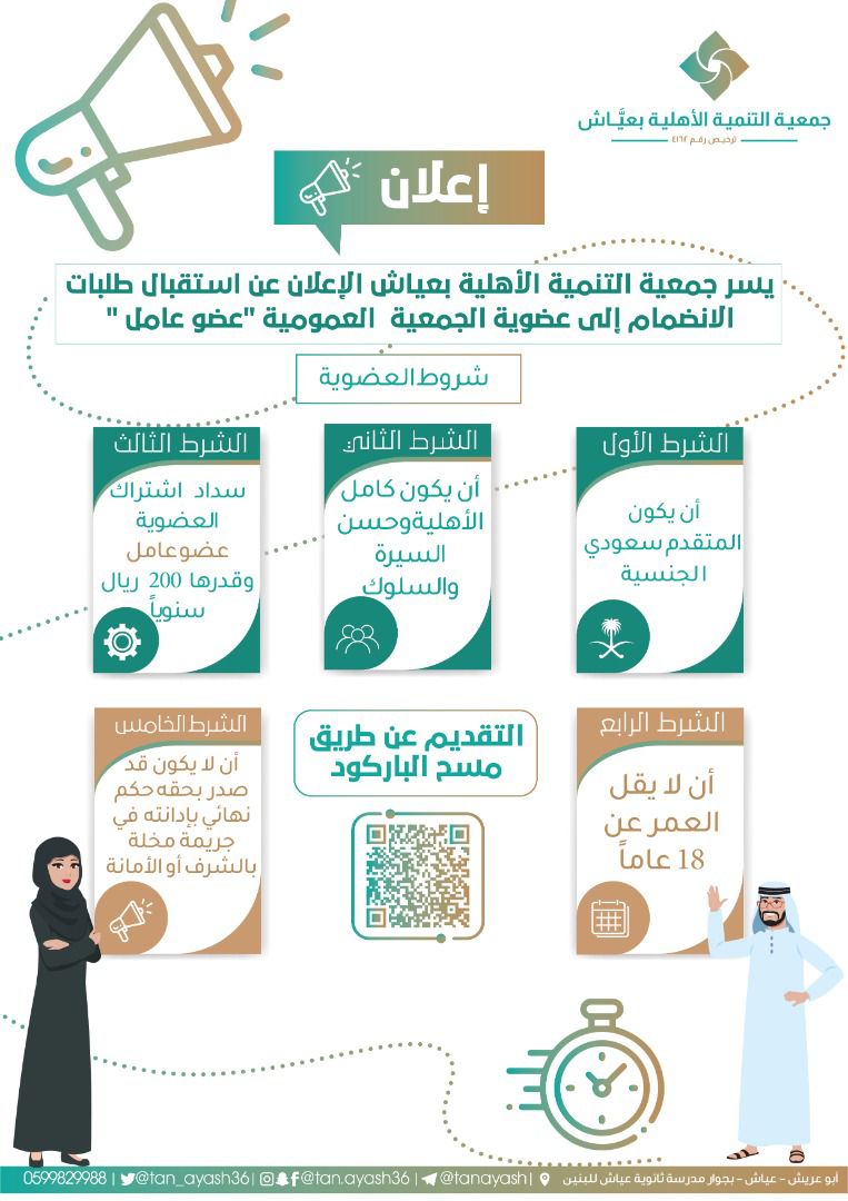 تهديكم جمعية التنمية الأهلية بعياش أطيب التحايا ويسرها الإعلان عن فتح باب التقديم لعضوية الجمعية العمومية "عضو عامل" وفق الشروط التالية: ١- أن يكون سعودي الجنسية. ٢- أن لا يقل العمر عن ١٨ عام. ٣- أن يكون كامل الأهلية وحسن السيرة والسلوك. ٤- سداد اشتراك العضوية عضو عامل وقدرها ٢٠٠ ريال سنويا. ٥- أن لا يكون قد صدر بحقه حكم نهائي بإدانته في جريمة مخله بالشرف أو الأمانة.